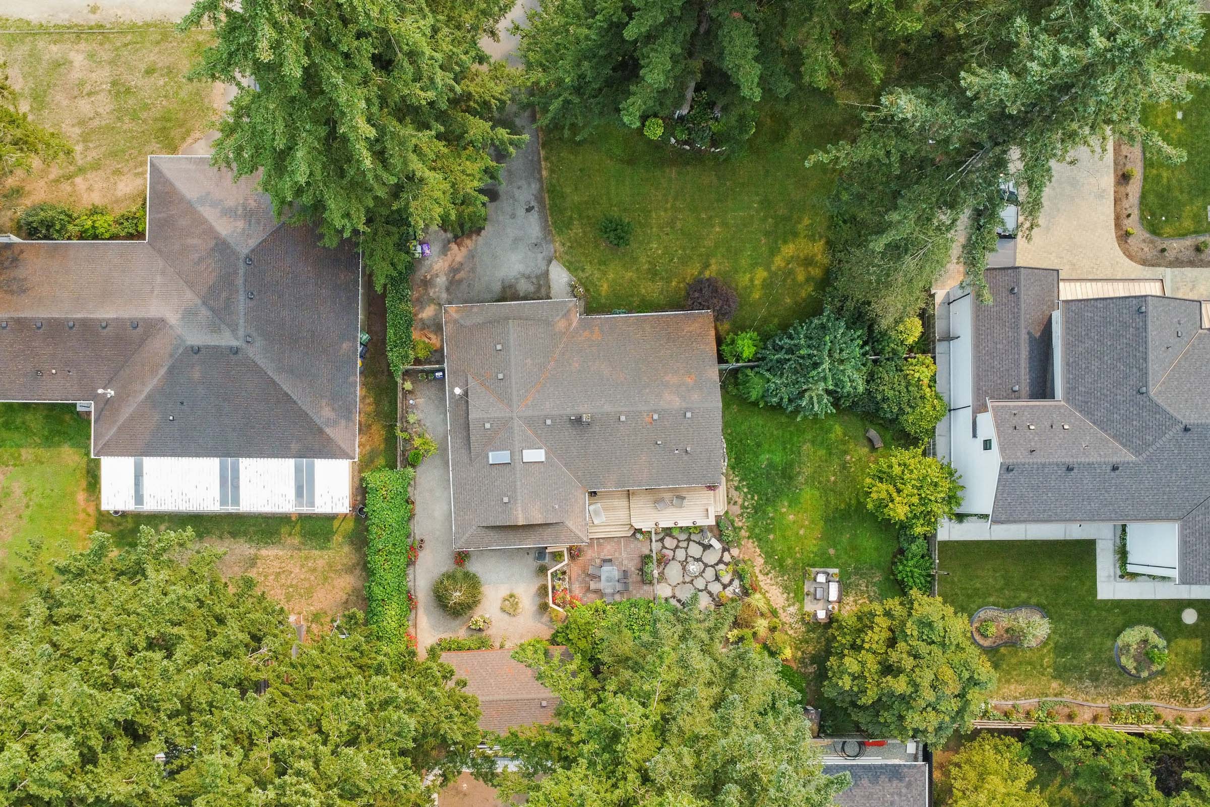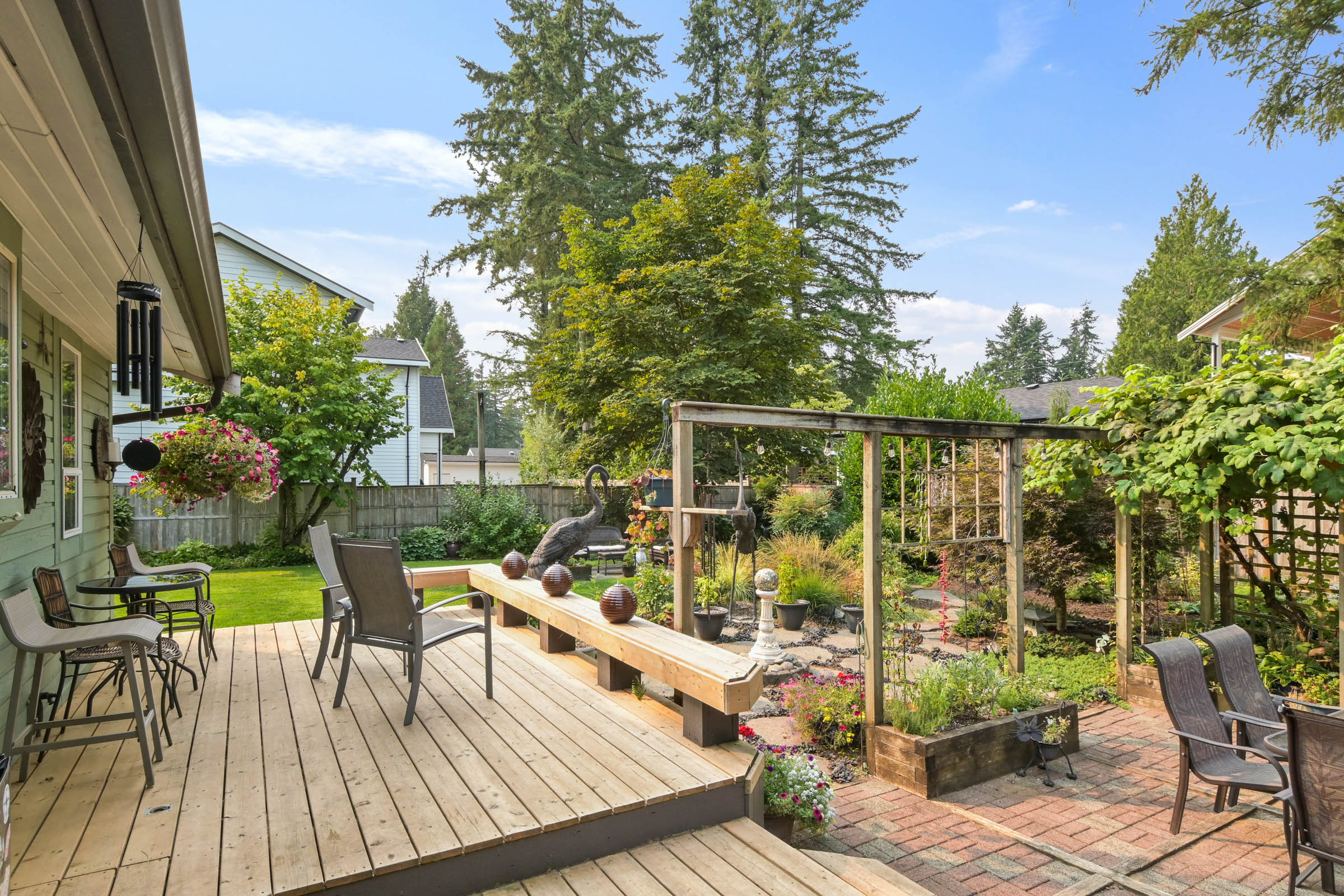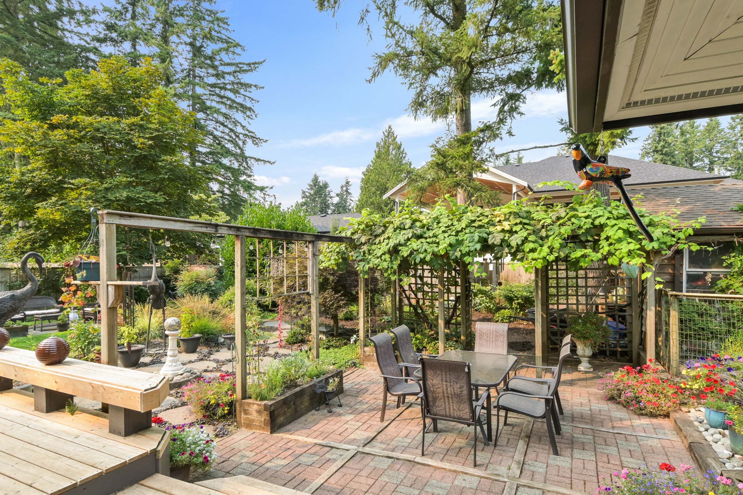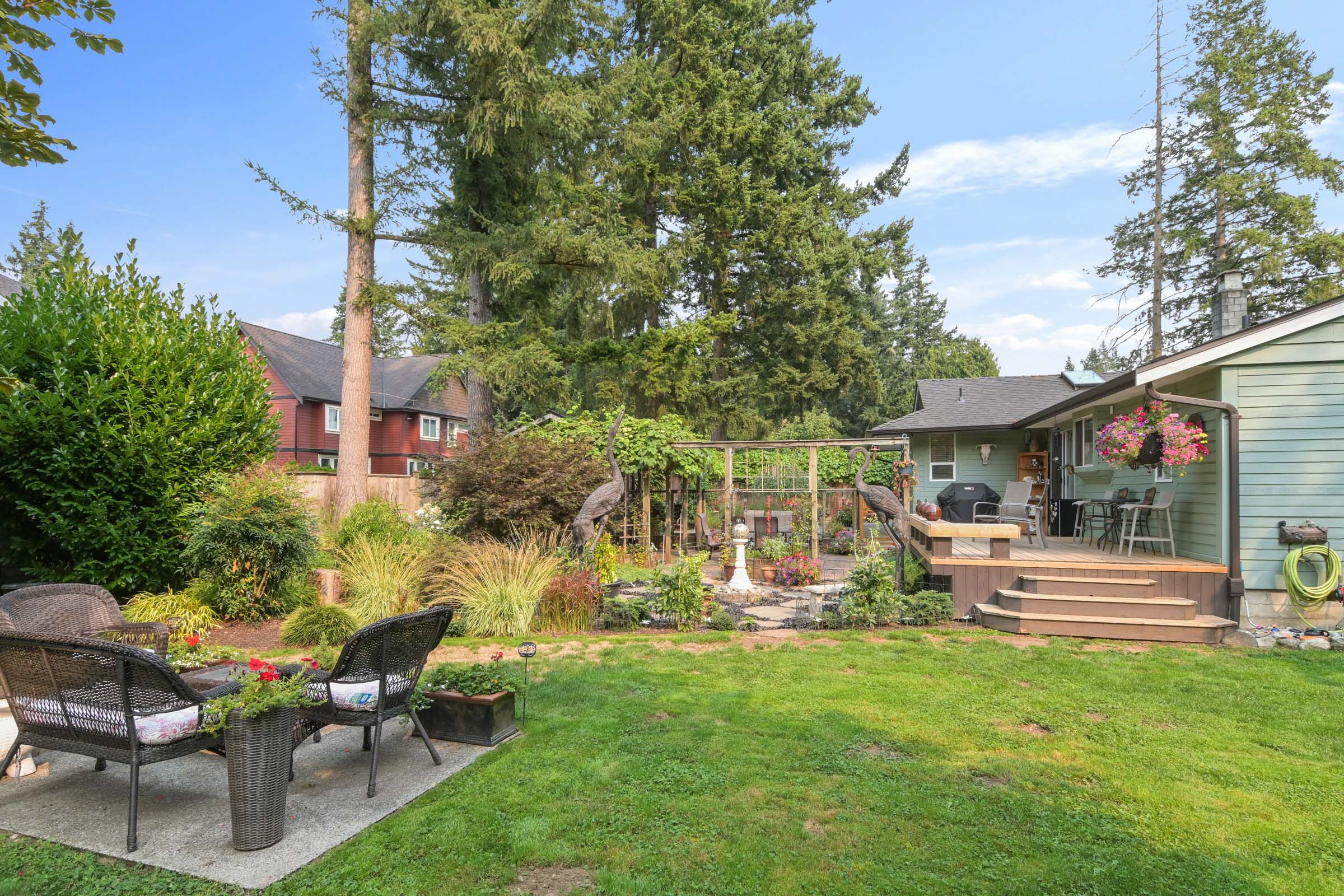 Oh my word, the backyard is so gorgeous and perfect for outdoor entertaining. Concord and champagne grapes, thoughtfully designated areas for sitting and sipping, a place for adults, kids and pets to hang out. Fully fenced. I can see someone who loves to garden but doesnt want a big house, moving in here, tending to this oasis, with room for the grandkids to come for a visit. Or a young family wanting a yard for the youngsters to play in safely and just enough room for everyone. The flex room has a single murphy bed and storage - bedroom/office/crafts. On this size lot zone R-1E allows for 2 homes or small multifamily unit. Noel Booth Elem and Brookswood Sec are the schools for this area. Bus stops on 200th, all in all an easy neighbourhood to live in, while being conveniently located.